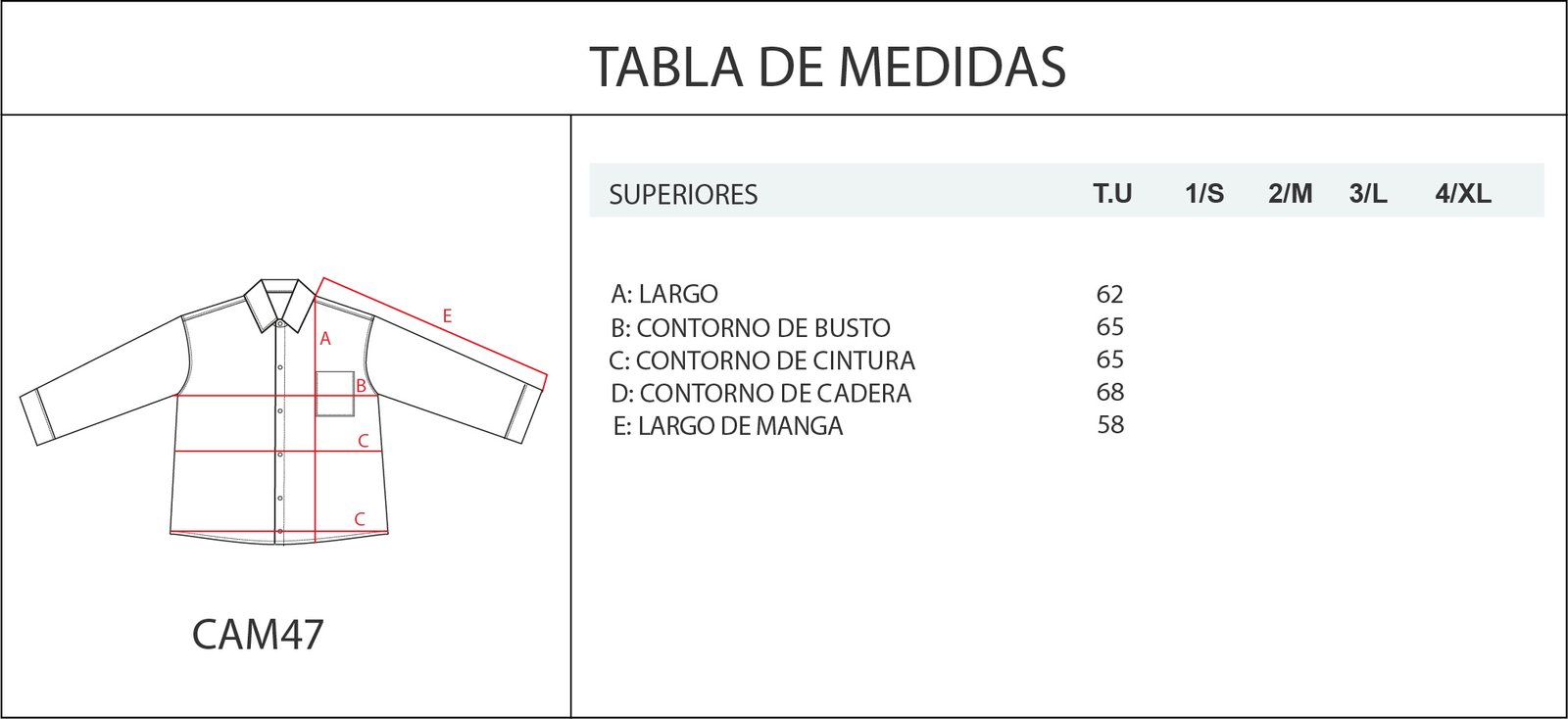 Descripcion: Camisa manga larga cuello solapa y manga larga. Cierre frontal con 6 botones y manga con boton. Bolsillo plaque en delantero. Espalda con canesu y tablon.