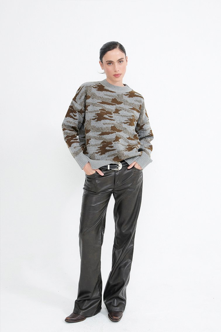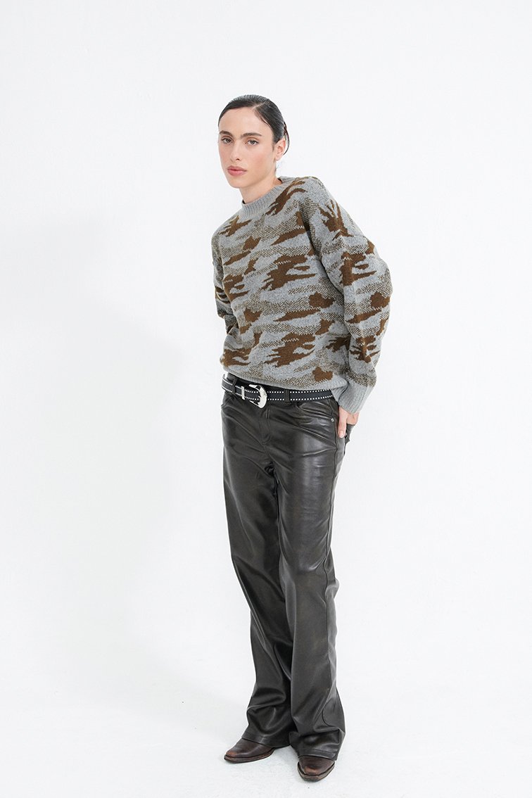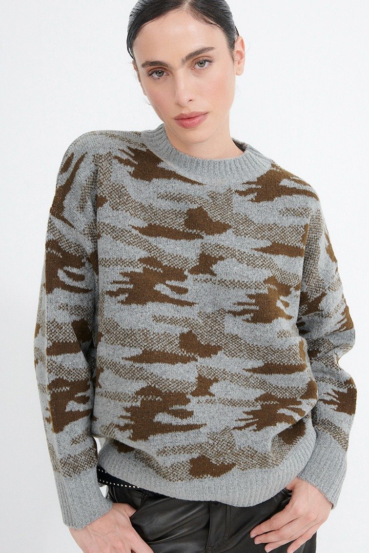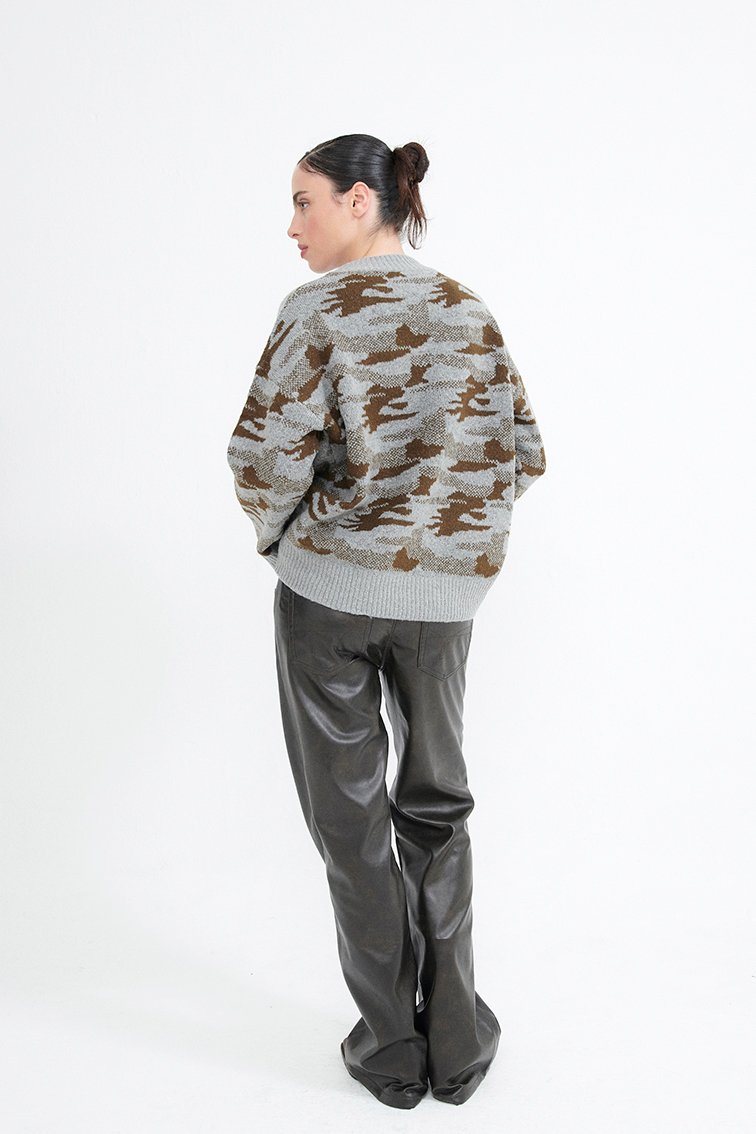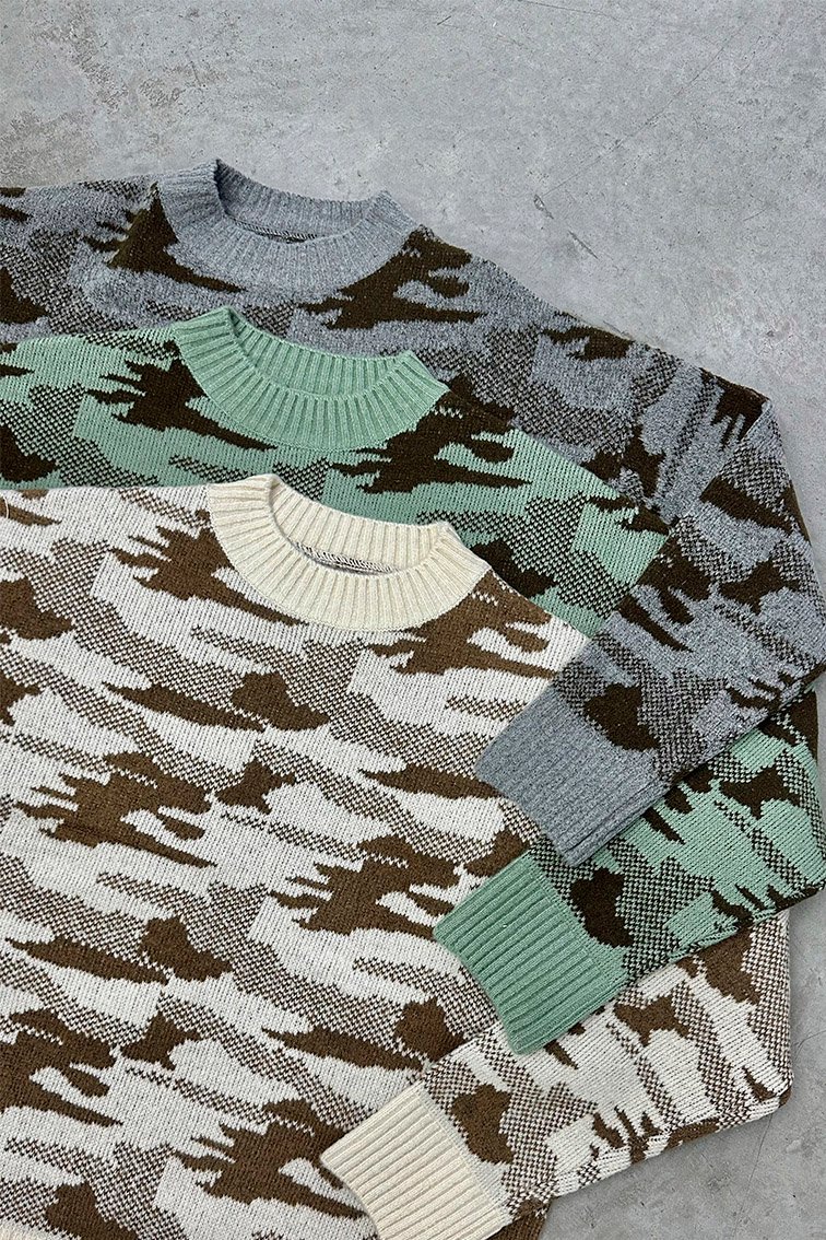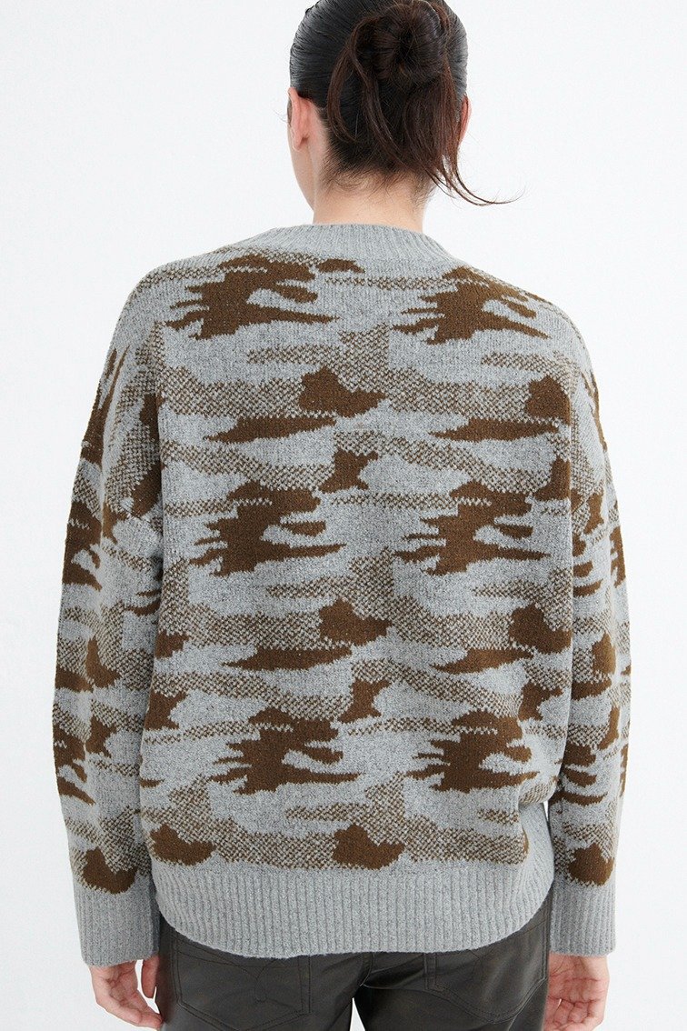 Descripcion: Sweater tejido camuflado. Cuello redondo, manga larga y acabado acanalado en cuello y cintura.